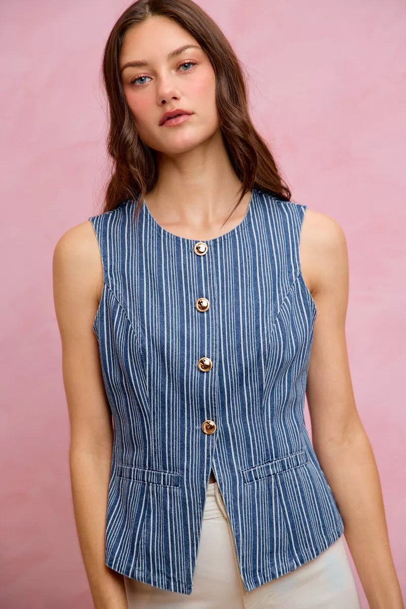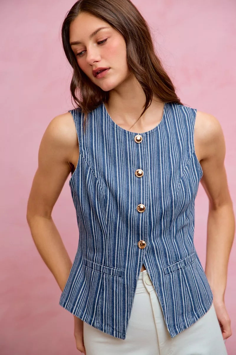 The Stripe Denim Slim Fit Button Front Denim Vest Top is a stylish and versatile piece that combines classic denim fabric with a slim fit silhouette. Featuring stripes for a modern twist, this vest top exudes a fashionable vibe. The button front adds a touch of detail and functionality to the design. Ideal for layering or wearing on its own, this vest top offers a trendy and casual look. Elevate your outfit with this chic and on-trend denim vest top that effortlessly blends style and comfort.